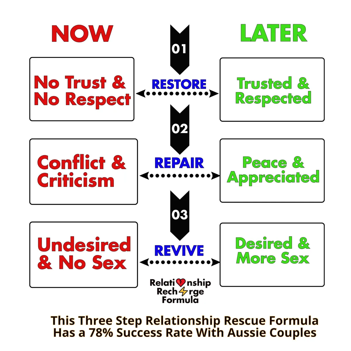 - Step#3: DEVELOP a customised 3-Step Relationship Recovery gameplan to restoring trust and respect, moving towards resolving conflicts and to reignite passion and intimacy sooner [just 'follow the bouncing ball' and stick to the formula that's proven to work].