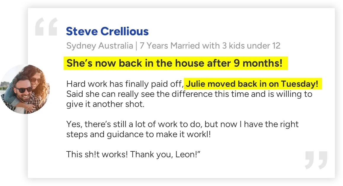While individual results may vary depending on the relationship situation, many men report revived connections, improved communication, and a deeper bond with their partner through this structured approach.